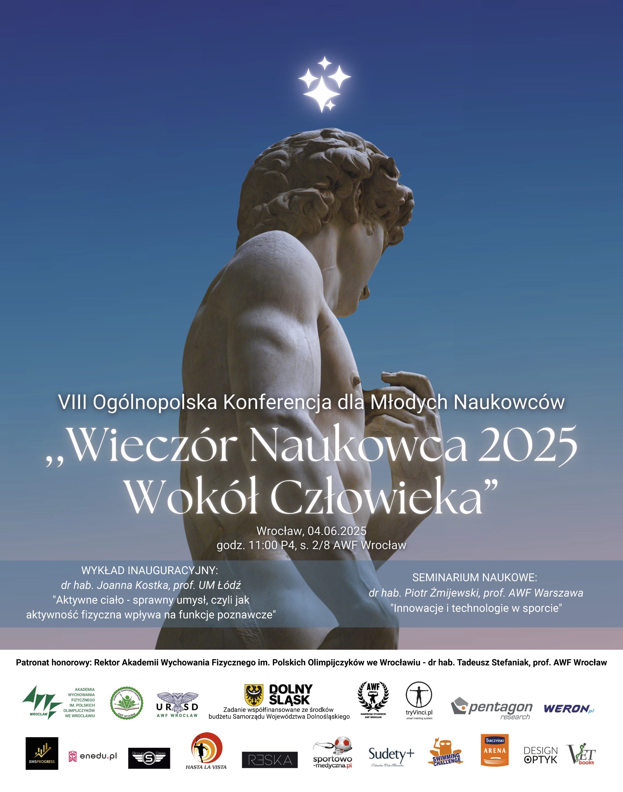 Kolejna edycja Wieczoru Naukowca już za nami! 4 czerwca 2025 r. Akademia Wychowania Fizycznego im. Polskich Olimpijczyków we Wrocławiu gościła rekordową liczbę uczestników z 25 krajowych uczelni. Zaprezentowano aż 90 wystąpień – zarówno podczas sesji plenarnych, jak i plakatowych. Łącznie, wraz z uczestnikami biernymi, w konferencji wzięło udział aż 168 młodych naukowców!